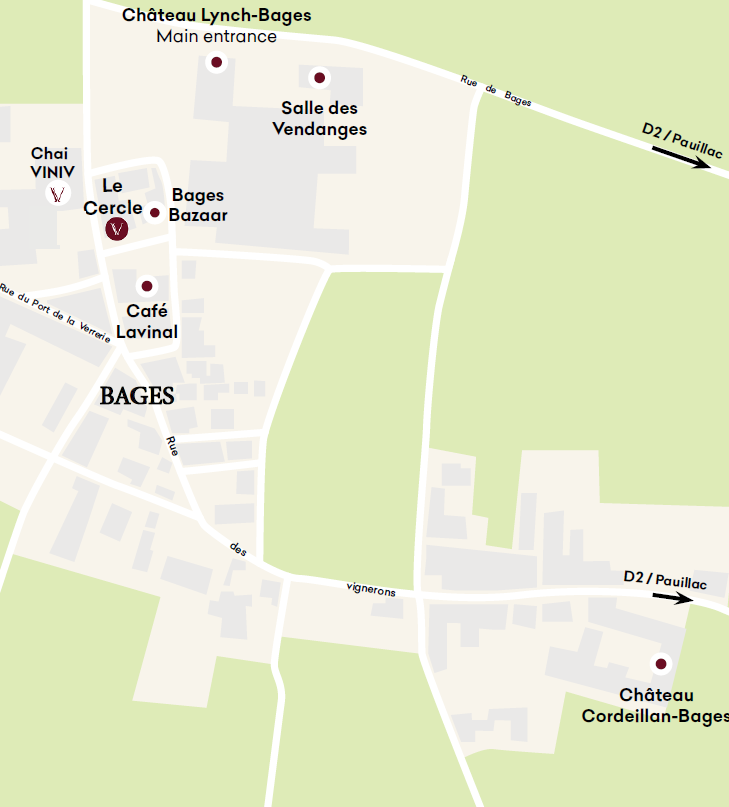 The Route des Châteaux will bring you to the entrance of Pauillac, and you will see the signs to Château Cordeillan-Bages on the left. Turn left here, and follow the aptly named Rue des Vignerons until you enter the small hamlet of Bages. You can park under the VINIV sign on the left hand side. Your blending session will take place in “Le Cercle Lynch-Bages” on the main square, just opposite Café Lavinal.